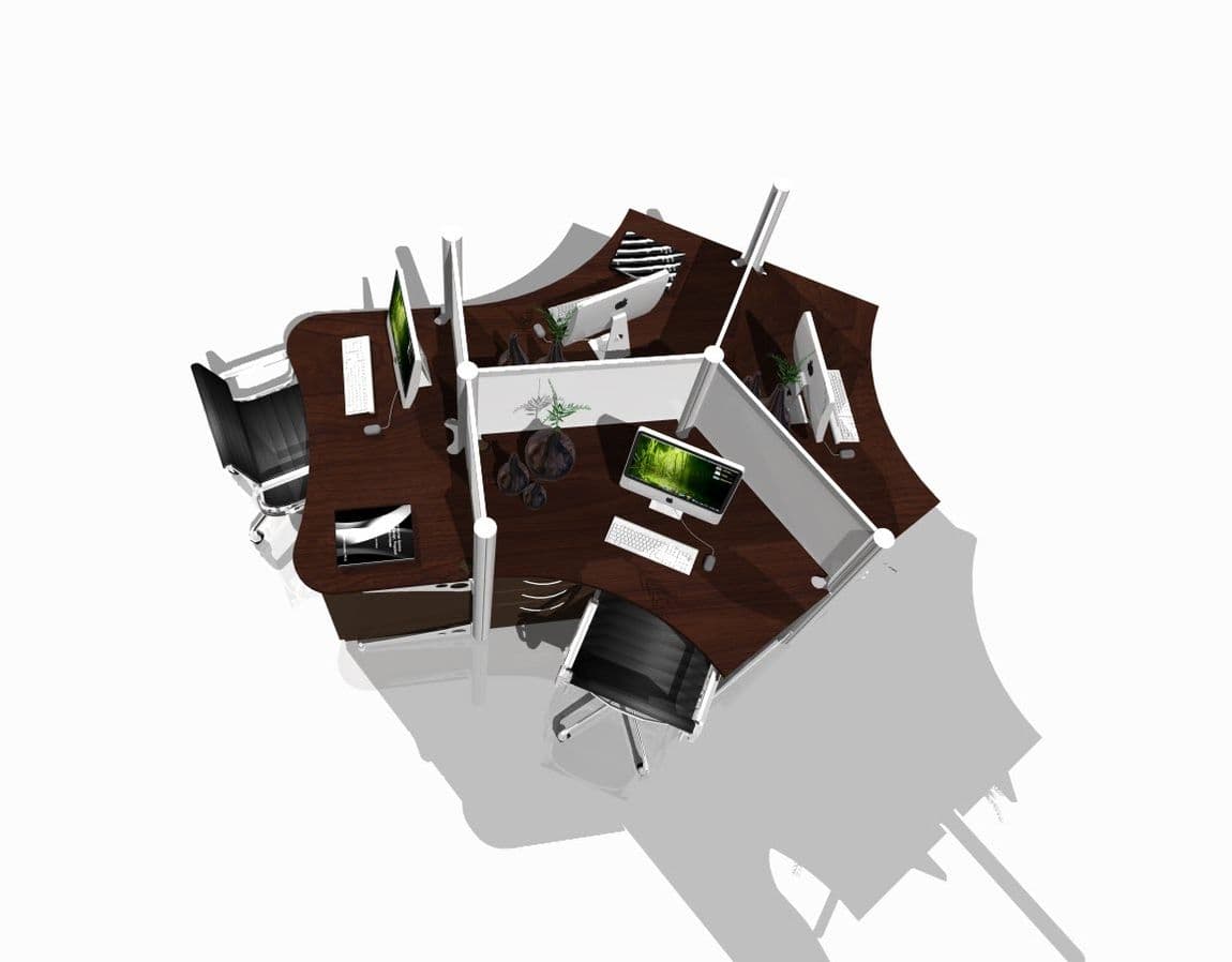 The efficient angles of this open, collaborative cubicle design allows businesses to optimize on their available square footage by allowing for a higher number of seats than most linear designs while still providing a sense of openness. When placed in an open plan, the geometry of the pods provides a more organic flow than rows and rows of liner cubicles. Available with or without rounded collaboration ends.