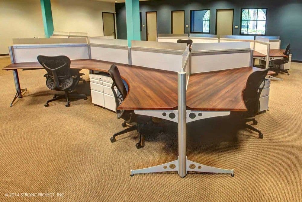 The efficient angles of this open, collaborative cubicle design allows businesses to optimize on their available square footage by allowing for a higher number of seats than most linear designs while still providing a sense of openness. When placed in an open plan, the geometry of the pods provides a more organic flow than rows and rows of liner cubicles. Available with or without rounded collaboration ends.