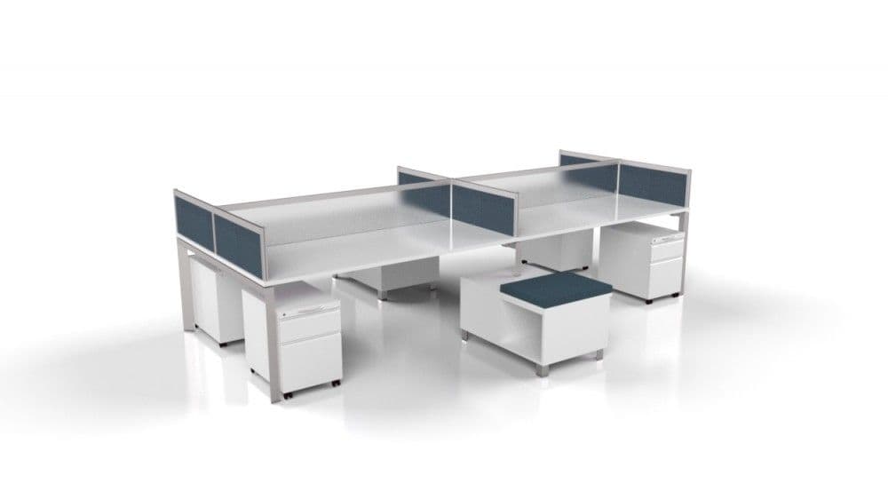 The beauty of this modern workstation design extends beyond its clean lines and aesthetic appeal, but is also rooted in its design flexibility. The foundation of this open plan furniture design is that of a modern benching system and it can be purely configured that way. For those companies seeking to give their staff a bit more privacy and acoustics than a pure benching system provides while maintaining an “open feel', this system is customizable with side dividers, frontal acoustic felt dividers and acrylic up-mounts. All heights of side dividers and frontal dividers are customizable.