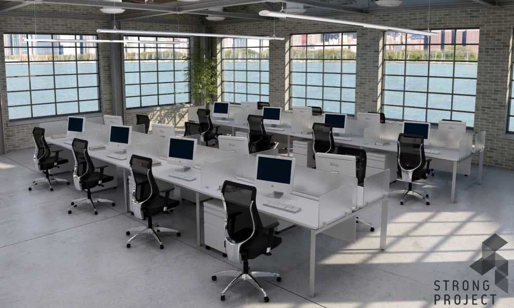 The beauty of this modern workstation design extends beyond its clean lines and aesthetic appeal, but is also rooted in its design flexibility. The foundation of this open plan furniture design is that of a modern benching system and it can be purely configured that way. For those companies seeking to give their staff a bit more privacy and acoustics than a pure benching system provides while maintaining an “open feel', this system is customizable with side dividers, frontal acoustic felt dividers and acrylic up-mounts. All heights of side dividers and frontal dividers are customizable.