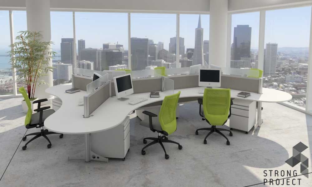 The efficient angles of this open, collaborative cubicle design allows businesses to optimize on their available square footage by allowing for a higher number of seats than most linear designs while still providing a sense of openness. When placed in an open plan, the geometry of the pods provides a more organic flow than rows and rows of liner cubicles. Available with or without rounded collaboration ends.