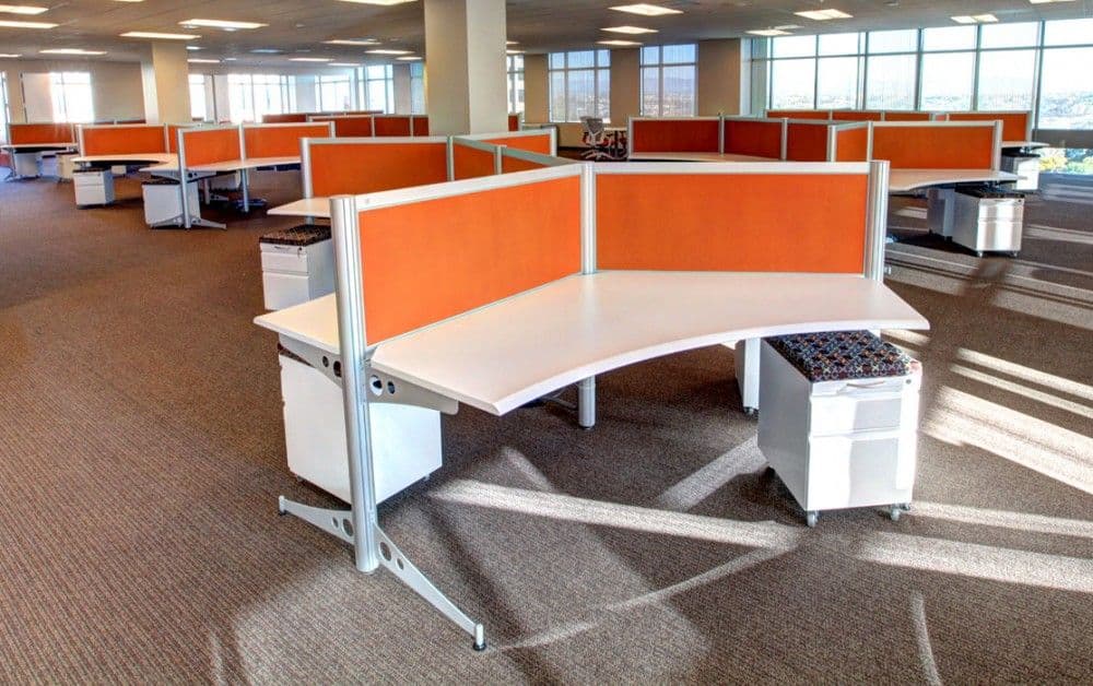 The efficient angles of this open, collaborative cubicle design allows businesses to optimize on their available square footage by allowing for a higher number of seats than most linear designs while still providing a sense of openness. When placed in an open plan, the geometry of the pods provides a more organic flow than rows and rows of liner cubicles. Available with or without rounded collaboration ends.