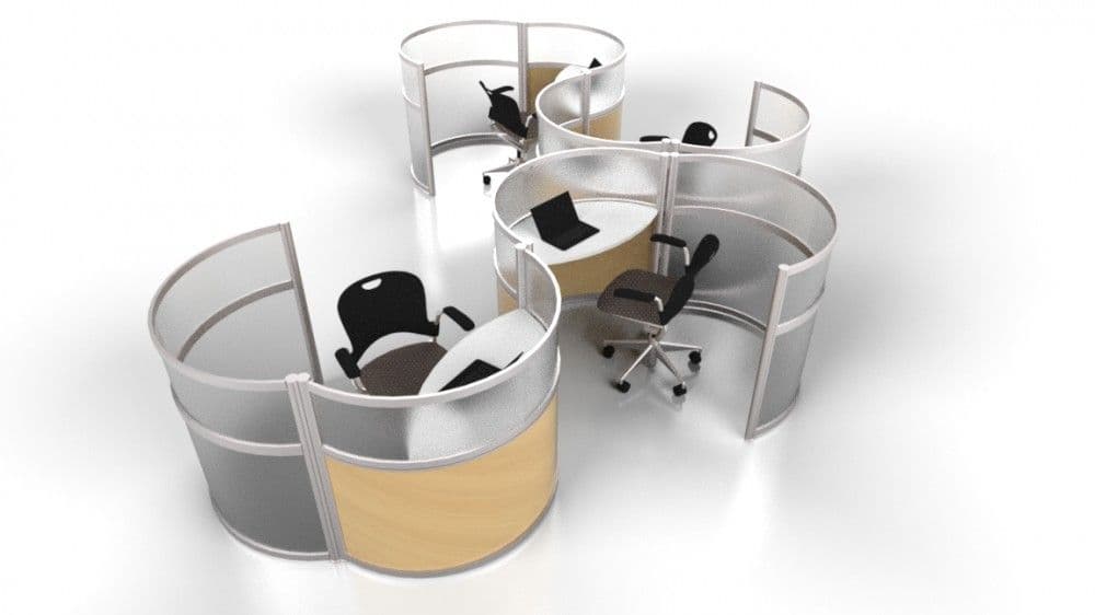 These Curved Workstation Pods are small footprint, ergonomic touch-down stations that provide partial or full enclosure in an open plan environment. They are perfect for business lounges, library enclaves, touch-down areas or any office area where one or many need to work in privacy or collaboratively. A flexible spline connects these cool workspace pods together in a variety of configurations. The spline also acts as an integrated hinge for swing doors to enclose or open up space. Worksurface mounted electrical and data modules allow you to plug-in and go.
