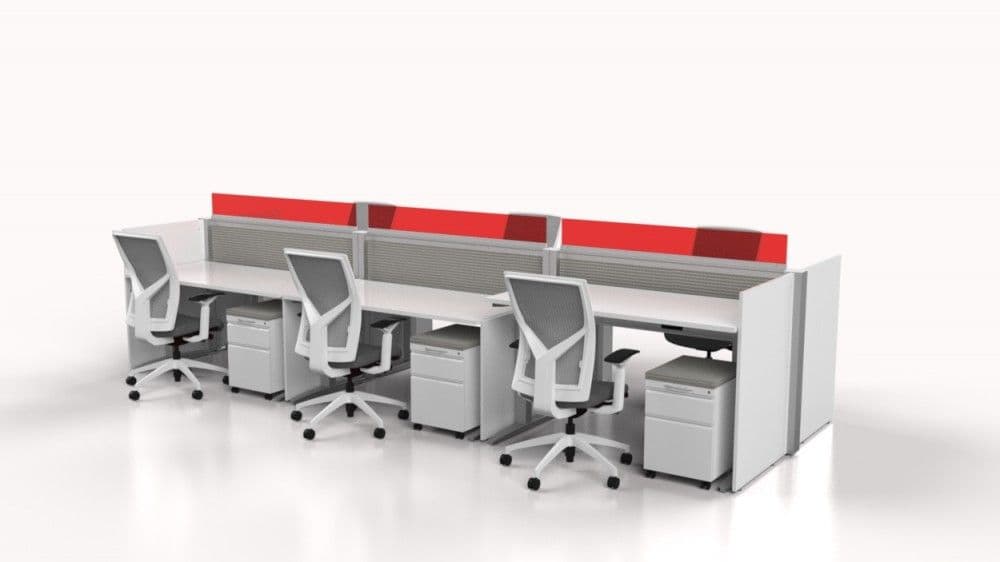 This modern height adjustable workstation system is customizable with laminate side panels with acrylic up-mounts as well as frontal acoustic felt dividers and acrylic up-mounts. All heights of the laminate dividers and acrylic up-mount screens are customizable. The most common divider heights to achieve a feeling of openness while giving users a sense of space and privacy are 42'H overall (laminate side panel + acrylic up-mount) coupled with 12' frontal acoustic dividers with an 8' acrylic up-mount. The most common desktop sizes are 30'D x 60'W, 30'D x 72'W and 30'D x 84'W, but these are customizable as well. The typical storage components coupled with this system are either a Mobile Filing Pedestal or a Low Storage Credenza containing oversized storage and filing drawers coupled with pop-up tech modules for USB and Electrical access to quick charge phones and tablets. Seat cushions can be applied to the low credenzas for impromptu quick meetings with an associate. This contemporary workstation system features a technology spine that accommodates ample data drops and includes an integrated 4-circuit/8-wire electrical system. From a design perspective, there are numerous laminate and thermofoil worksurface and side panel finish options in modern woodgrains as well as white and other solids. The frontal acoustic felt dividers come in 15 different colors to work with your building interior and brand as well as COMs. The frontal up-mounts and side dividers have numerous acrylic color options as well as customization capability with resins such as 3form, Lumicor, etc. This stylish modular office furniture system will give you the flexibility to create a work environment that provides users with their own sense of space, fosters creativity and well-being and can be customized from a design perspective to meld with your building interior and brand. This modern workstation design would fall under the “Pro' budget range of our Budget Your Office Tool.
