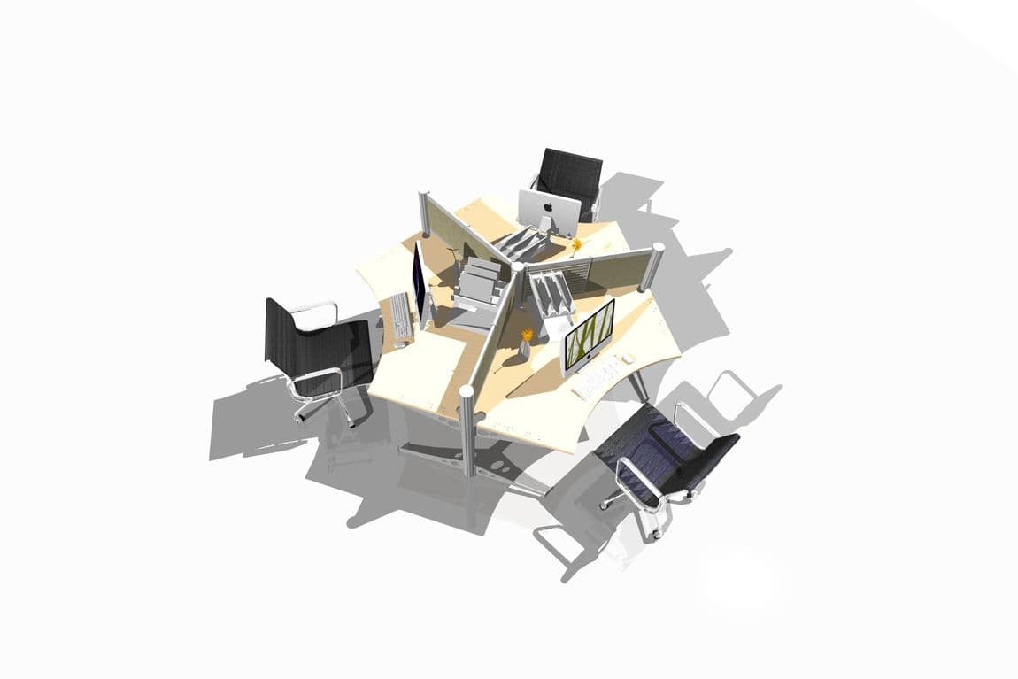 The efficient angles of this open, collaborative cubicle design allows businesses to optimize on their available square footage by allowing for a higher number of seats than most linear designs while still providing a sense of openness. When placed in an open plan, the geometry of the pods provides a more organic flow than rows and rows of liner cubicles. Available with or without rounded collaboration ends.