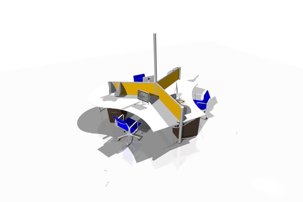 The efficient angles of this open, collaborative cubicle design allows businesses to optimize on their available square footage by allowing for a higher number of seats than most linear designs while still providing a sense of openness. When placed in an open plan, the geometry of the pods provides a more organic flow than rows and rows of liner cubicles. Available with or without rounded collaboration ends.