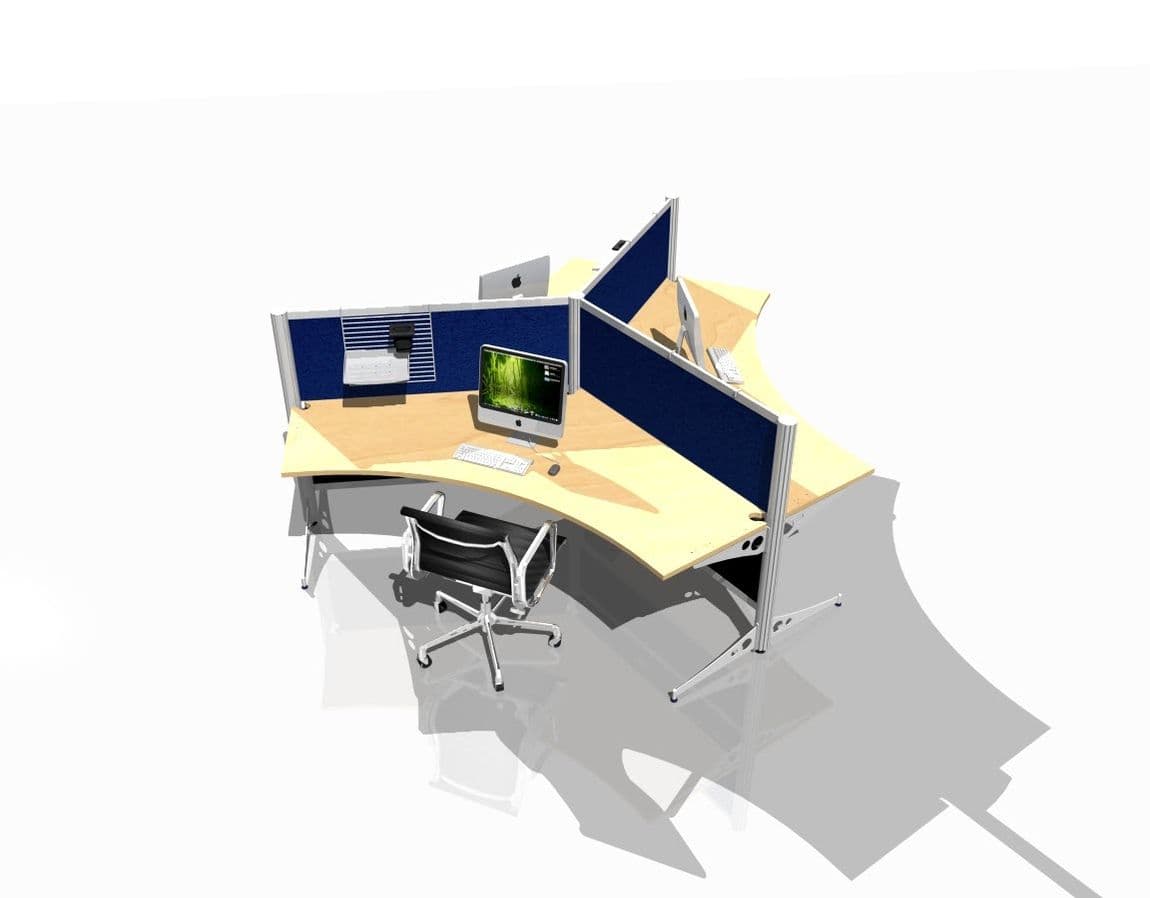 The efficient angles of this open, collaborative cubicle design allows businesses to optimize on their available square footage by allowing for a higher number of seats than most linear designs while still providing a sense of openness. When placed in an open plan, the geometry of the pods provides a more organic flow than rows and rows of liner cubicles. Available with or without rounded collaboration ends.