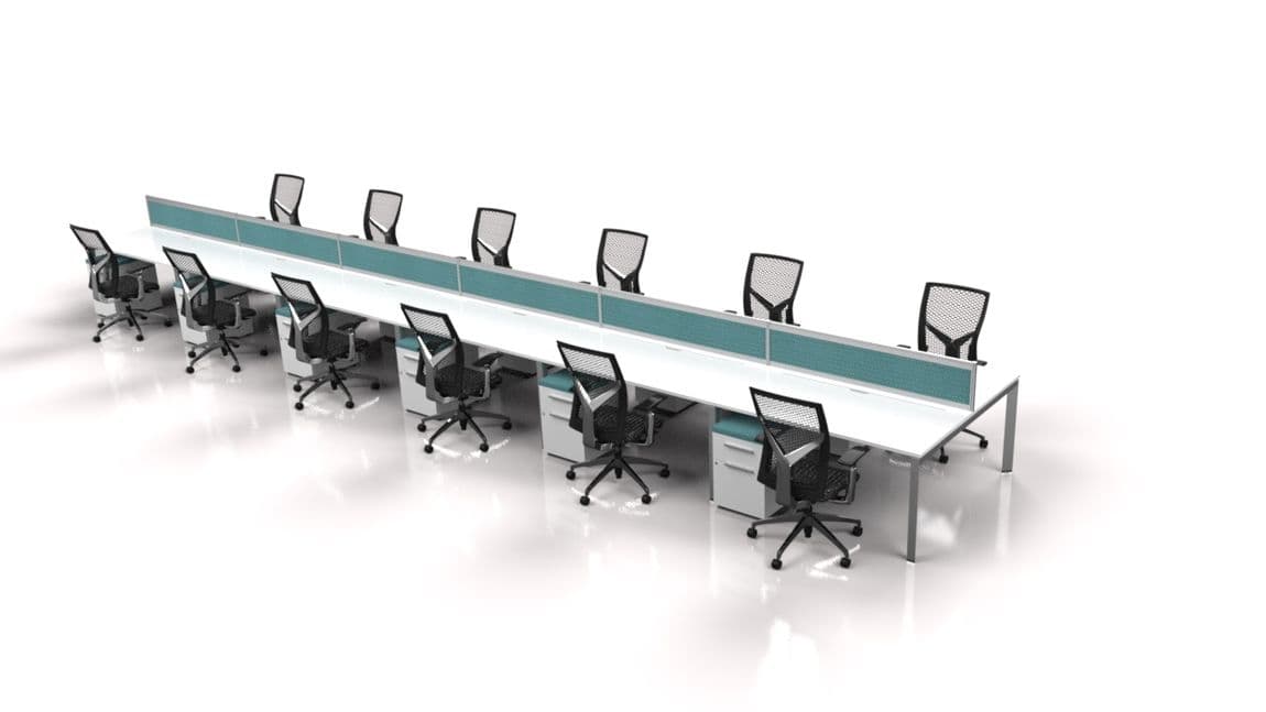The beauty of this modern workstation design extends beyond its clean lines and aesthetic appeal, but is also rooted in its design flexibility. The foundation of this open plan furniture design is that of a modern benching system and it can be purely configured that way. For those companies seeking to give their staff a bit more privacy and acoustics than a pure benching system provides while maintaining an “open feel', this system is customizable with side dividers, frontal acoustic felt dividers and acrylic up-mounts. All heights of side dividers and frontal dividers are customizable.