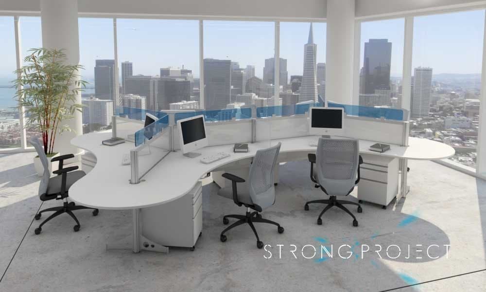 The efficient angles of this open, collaborative cubicle design allows businesses to optimize on their available square footage by allowing for a higher number of seats than most linear designs while still providing a sense of openness. When placed in an open plan, the geometry of the pods provides a more organic flow than rows and rows of liner cubicles. Available with or without rounded collaboration ends.