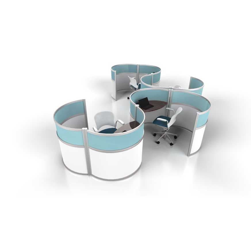 These Curved Workstation Pods are small footprint, ergonomic touch-down stations that provide partial or full enclosure in an open plan environment. They are perfect for business lounges, library enclaves, touch-down areas or any office area where one or many need to work in privacy or collaboratively. A flexible spline connects these cool workspace pods together in a variety of configurations. The spline also acts as an integrated hinge for swing doors to enclose or open up space. Worksurface mounted electrical and data modules allow you to plug-in and go.