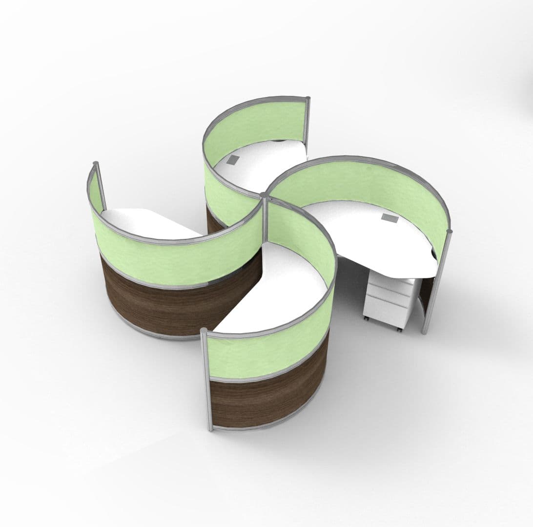These Curved Workstation Pods are small footprint, ergonomic touch-down stations that provide partial or full enclosure in an open plan environment. They are perfect for business lounges, library enclaves, touch-down areas or any office area where one or many need to work in privacy or collaboratively. A flexible spline connects these cool workspace pods together in a variety of configurations. The spline also acts as an integrated hinge for swing doors to enclose or open up space. Worksurface mounted electrical and data modules allow you to plug-in and go.