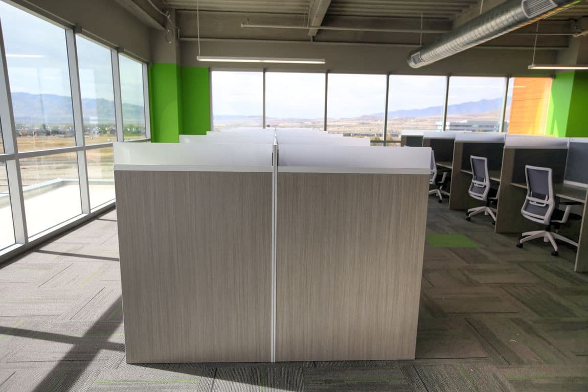 The Station size as shown is 30'D x 60'W x 54'H. Other common sizes for this design would be 30'D x 48'W (on the smaller side) and 30'D x 72'W if more desktop space is needed. Panel heights are customizable. There are numerous laminate panel applications in modern woodgrains as well as white. The interior acoustic felt comes in 15 different colors to work with your building interior and brand.
