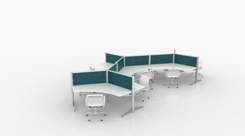 The efficient angles of this open, collaborative cubicle design allows businesses to optimize on their available square footage by allowing for a higher number of seats than most linear designs while still providing a sense of openness. When placed in an open plan, the geometry of the pods provides a more organic flow than rows and rows of liner cubicles. Available with or without rounded collaboration ends.