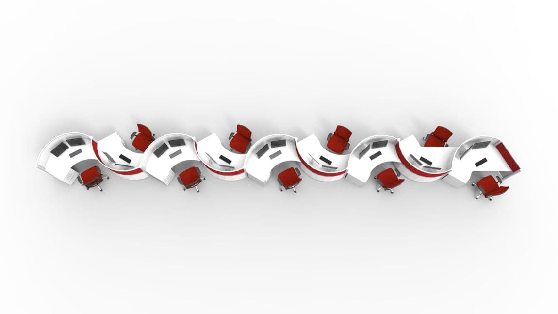 Of our many Curved Workstation designs, this particular one provides a more compact design while still delivering power and data integration. When placed in an open plan, the curved geometry of the pods provides a more organic flow than rows and rows of liner cubicles. For a truly unique, futuristic looking office space, explore our Modern Curved Workstations.
