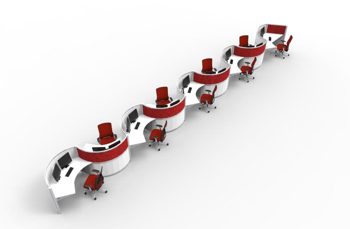 Of our many Curved Workstation designs, this particular one provides a more compact design while still delivering power and data integration. When placed in an open plan, the curved geometry of the pods provides a more organic flow than rows and rows of liner cubicles. For a truly unique, futuristic looking office space, explore our Modern Curved Workstations.