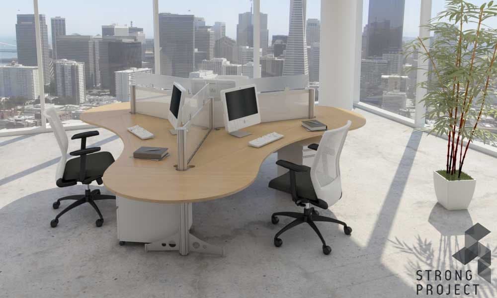The efficient angles of this open, collaborative cubicle design allows businesses to optimize on their available square footage by allowing for a higher number of seats than most linear designs while still providing a sense of openness. When placed in an open plan, the geometry of the pods provides a more organic flow than rows and rows of liner cubicles. Available with or without rounded collaboration ends.