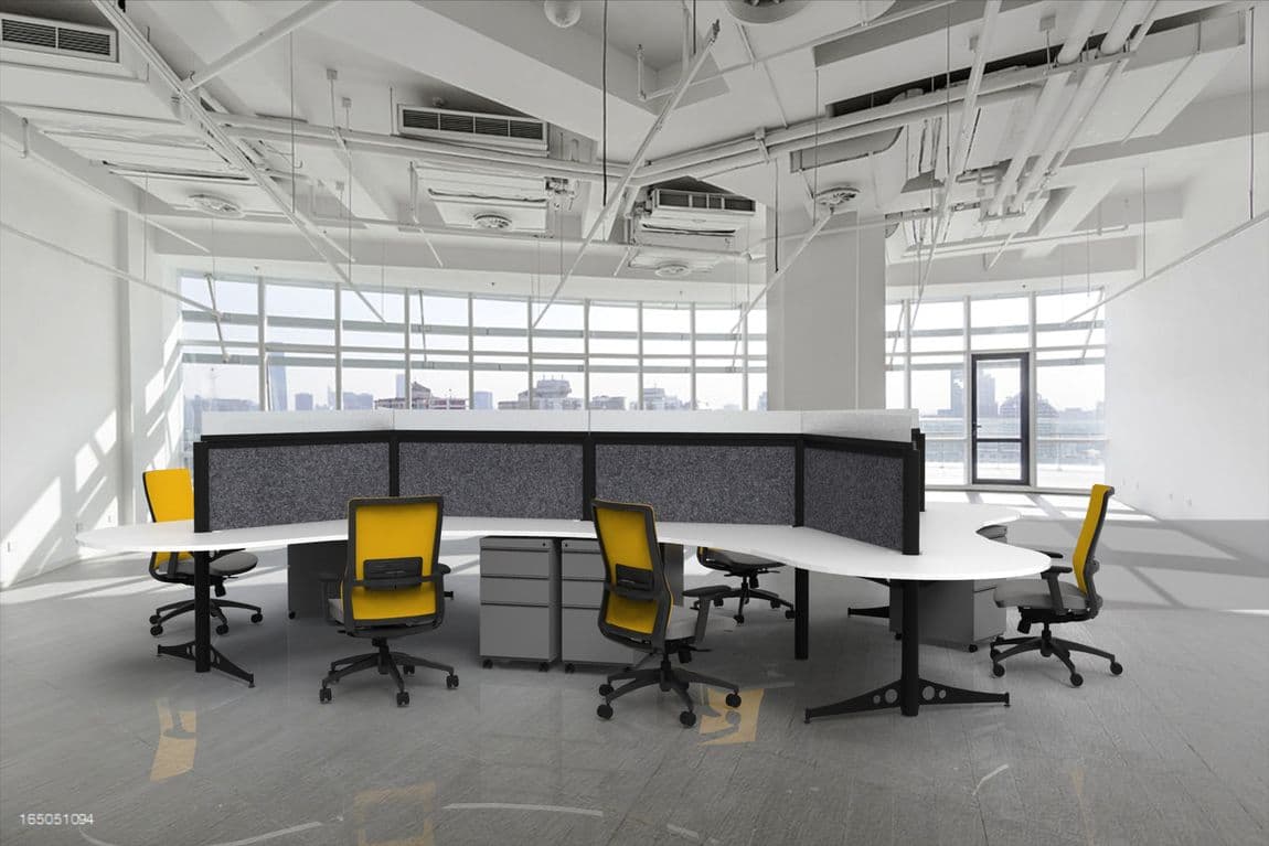 The efficient angles of this open, collaborative cubicle design allows businesses to optimize on their available square footage by allowing for a higher number of seats than most linear designs while still providing a sense of openness. When placed in an open plan, the geometry of the pods provides a more organic flow than rows and rows of liner cubicles. Available with or without rounded collaboration ends.