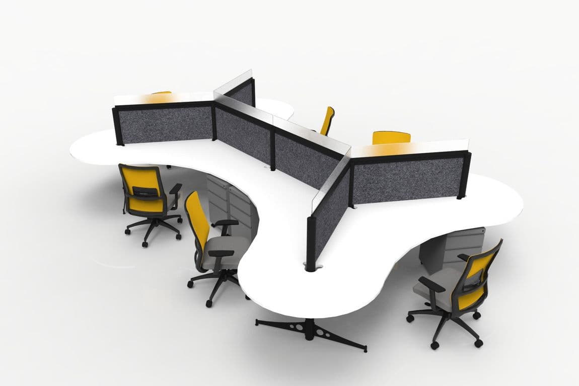 The efficient angles of this open, collaborative cubicle design allows businesses to optimize on their available square footage by allowing for a higher number of seats than most linear designs while still providing a sense of openness. When placed in an open plan, the geometry of the pods provides a more organic flow than rows and rows of liner cubicles. Available with or without rounded collaboration ends.