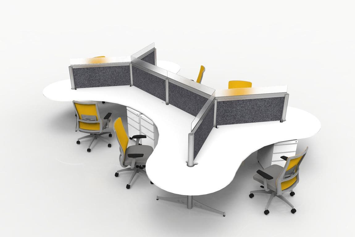 The efficient angles of this open, collaborative cubicle design allows businesses to optimize on their available square footage by allowing for a higher number of seats than most linear designs while still providing a sense of openness. When placed in an open plan, the geometry of the pods provides a more organic flow than rows and rows of liner cubicles. Available with or without rounded collaboration ends.