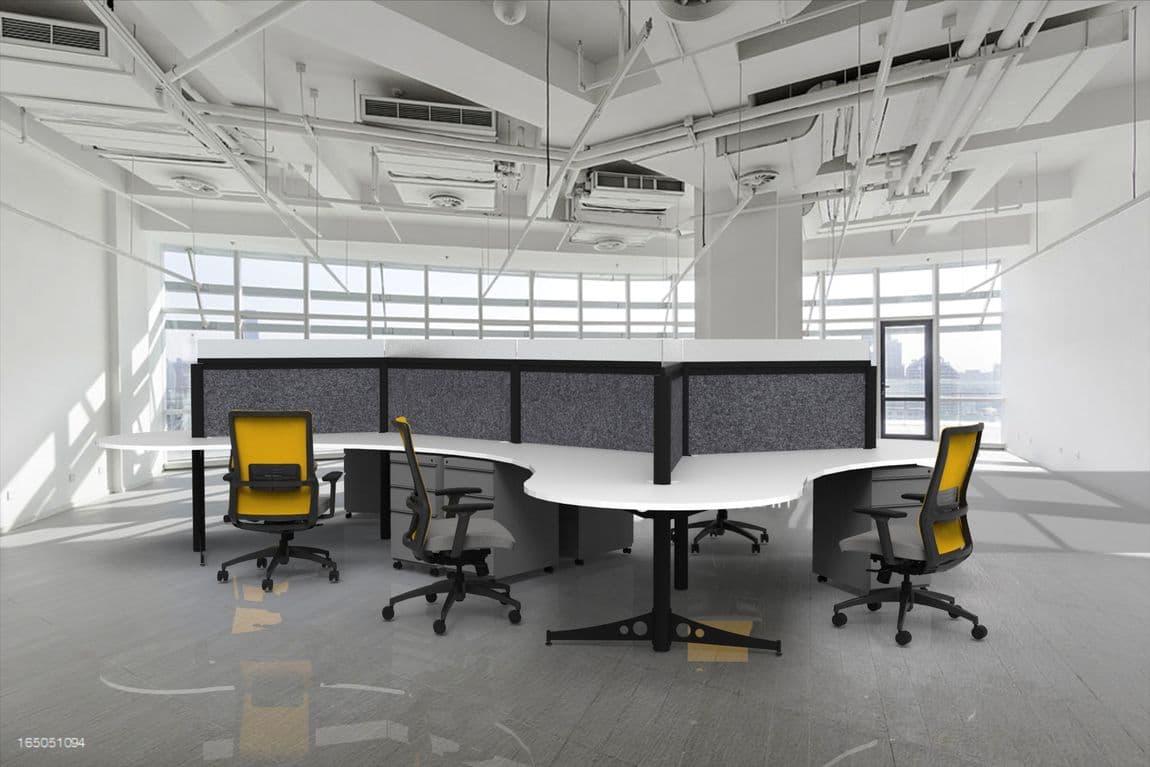 The efficient angles of this open, collaborative cubicle design allows businesses to optimize on their available square footage by allowing for a higher number of seats than most linear designs while still providing a sense of openness. When placed in an open plan, the geometry of the pods provides a more organic flow than rows and rows of liner cubicles. Available with or without rounded collaboration ends.