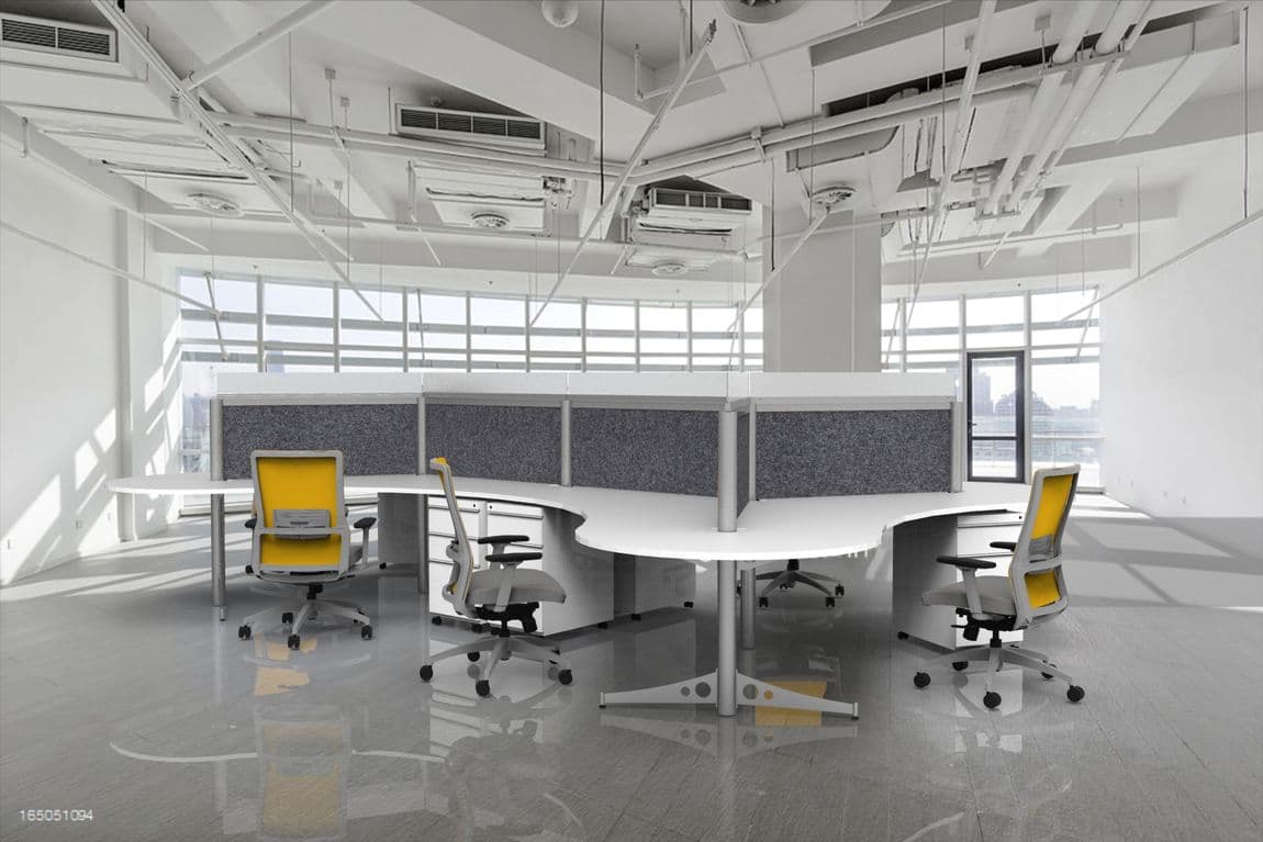 The efficient angles of this open, collaborative cubicle design allows businesses to optimize on their available square footage by allowing for a higher number of seats than most linear designs while still providing a sense of openness. When placed in an open plan, the geometry of the pods provides a more organic flow than rows and rows of liner cubicles. Available with or without rounded collaboration ends.