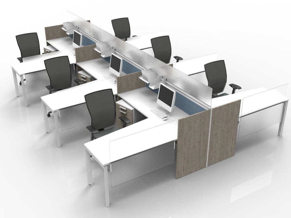 These sleek and stylish modern workstations feature rustic woodgrain panels and worksurfaces combined with architectural metal legs along with acoustic felt dividers to blend form and function for today’s modern workspaces. Also featured are our unique flared worksurfaces that provide more usable desktop space in a compact workstation footprint.