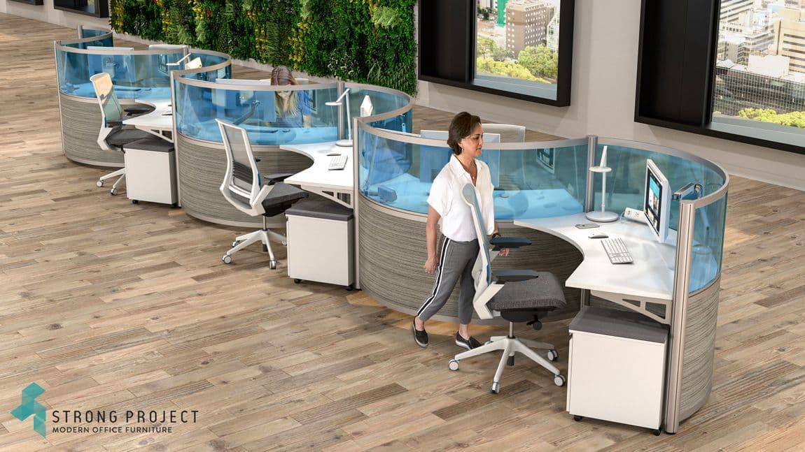 Of our many Curved Workstation designs, this particular one provides a more compact design while still delivering power and data integration. When placed in an open plan, the curved geometry of the pods provides a more organic flow than rows and rows of liner cubicles. For a truly unique, futuristic looking office space, explore our Modern Curved Workstations.