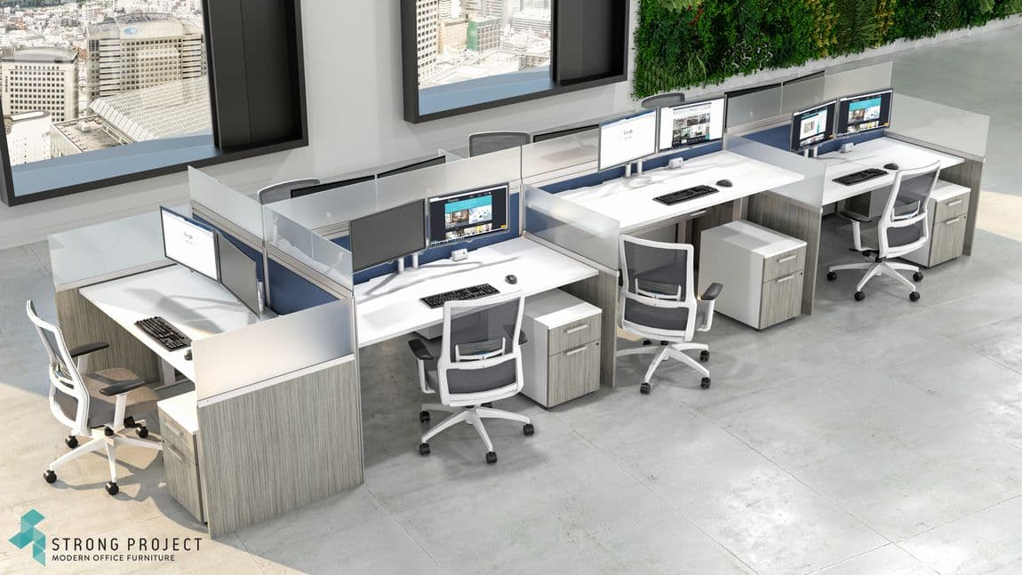 The Station size as shown is 30'D x 60'W x 54'H. Other common sizes for this design would be 30'D x 48'W (on the smaller side) and 30'D x 72'W if more desktop space is needed. Panel heights are customizable. There are numerous laminate panel applications in modern woodgrains as well as white. The interior acoustic felt comes in 15 different colors to work with your building interior and brand.
