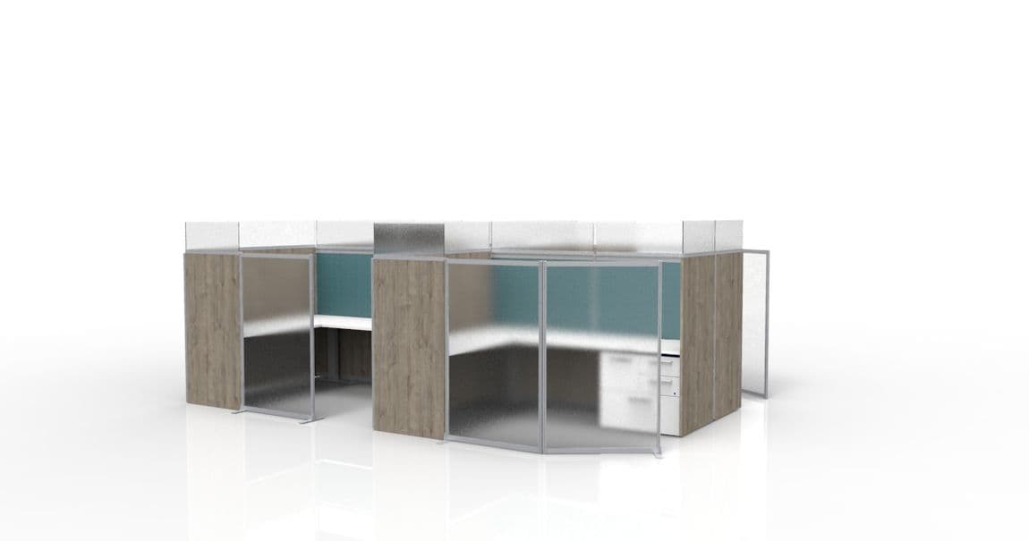 This private office cubicle solution is 72”H, so that when standing at a sit-stand desk, there is still shielding if someone were to cough or sneeze. The workstation components are made of easily cleanable materials such as laminate, acrylic and marker board. The optional interior fabric tack panels are Bleach-Cleanable and if you’d rather have 100% marker board for your interior panels, you have that option instead. Shown in 6’ x 8’ footprint.