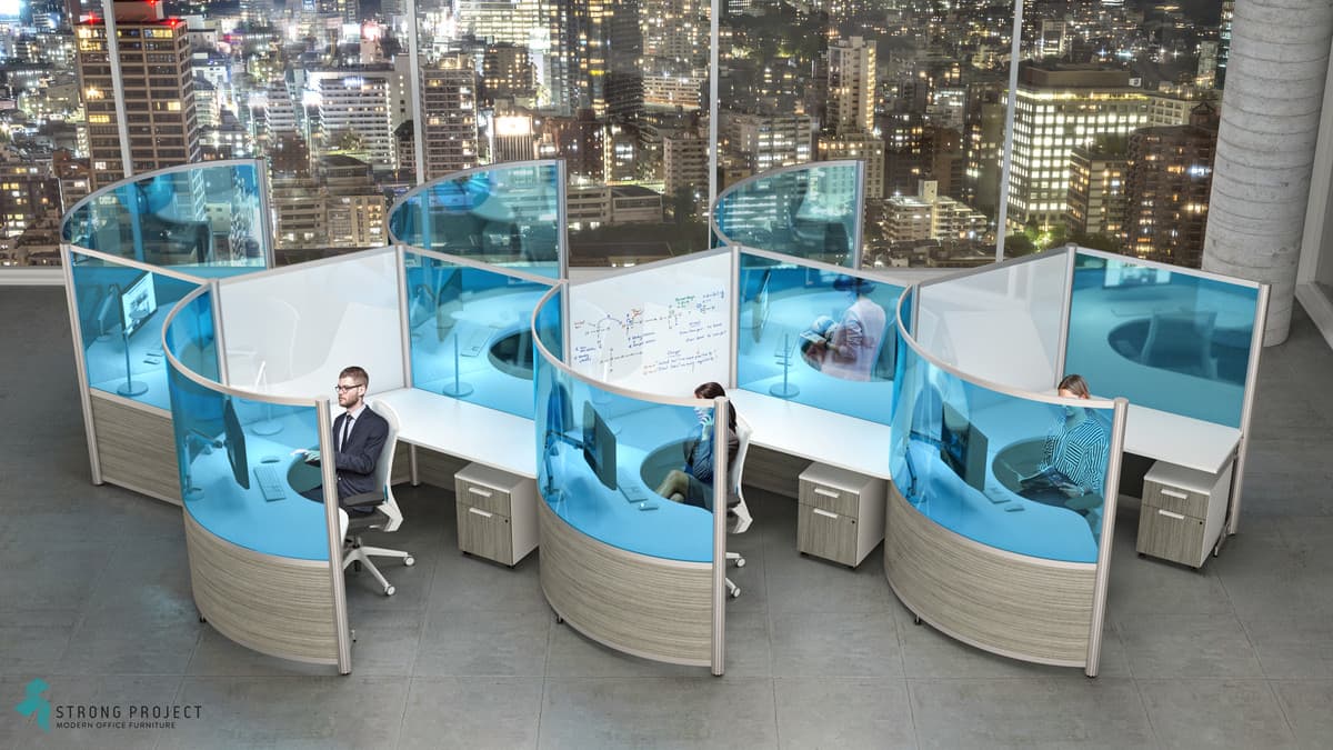 Curved Cubicles with Privacy Screens for Social Distancing with Modern Style! This curved cubicle “privacy design” is 66”H, so that there is sufficient shielding if someone were to cough or sneeze at their desk. The workstation components are made of easily cleanable materials such as laminate, acrylic and marker board. Shown in a 66”H x 96” Diameter workstation footprint. We have the ability to customize Heights for more or less privacy.