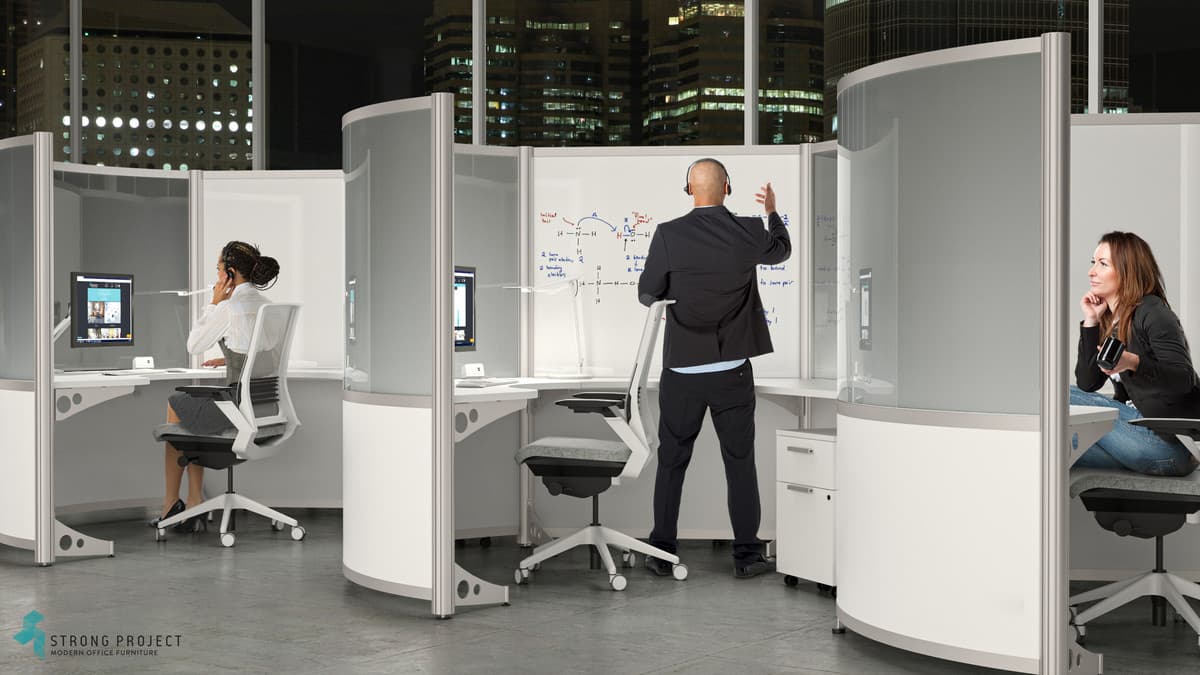 Curved Cubicles with Privacy Screens for Social Distancing with Modern Style! This curved cubicle “privacy design” is 66”H, so that there is sufficient shielding if someone were to cough or sneeze at their desk. The workstation components are made of easily cleanable materials such as laminate, acrylic and marker board. Shown in a 66”H x 96” Diameter workstation footprint. We have the ability to customize Heights for more or less privacy.