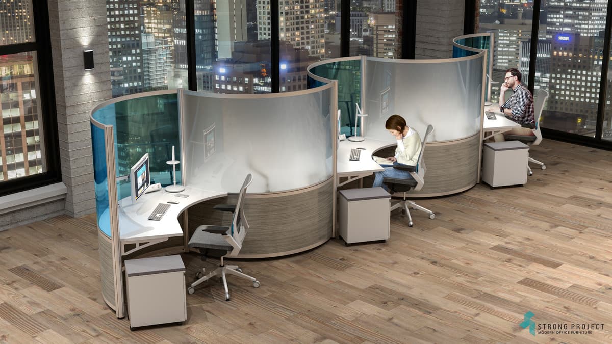 This open plan workstation design combines modern curves with space efficiency coupled with additional shielding if someone were to cough or sneeze at their desk. When placed in an open plan, the curved geometry of the pods provides a more organic flow and futuristic vibe than rows and rows of linear cubicles.
