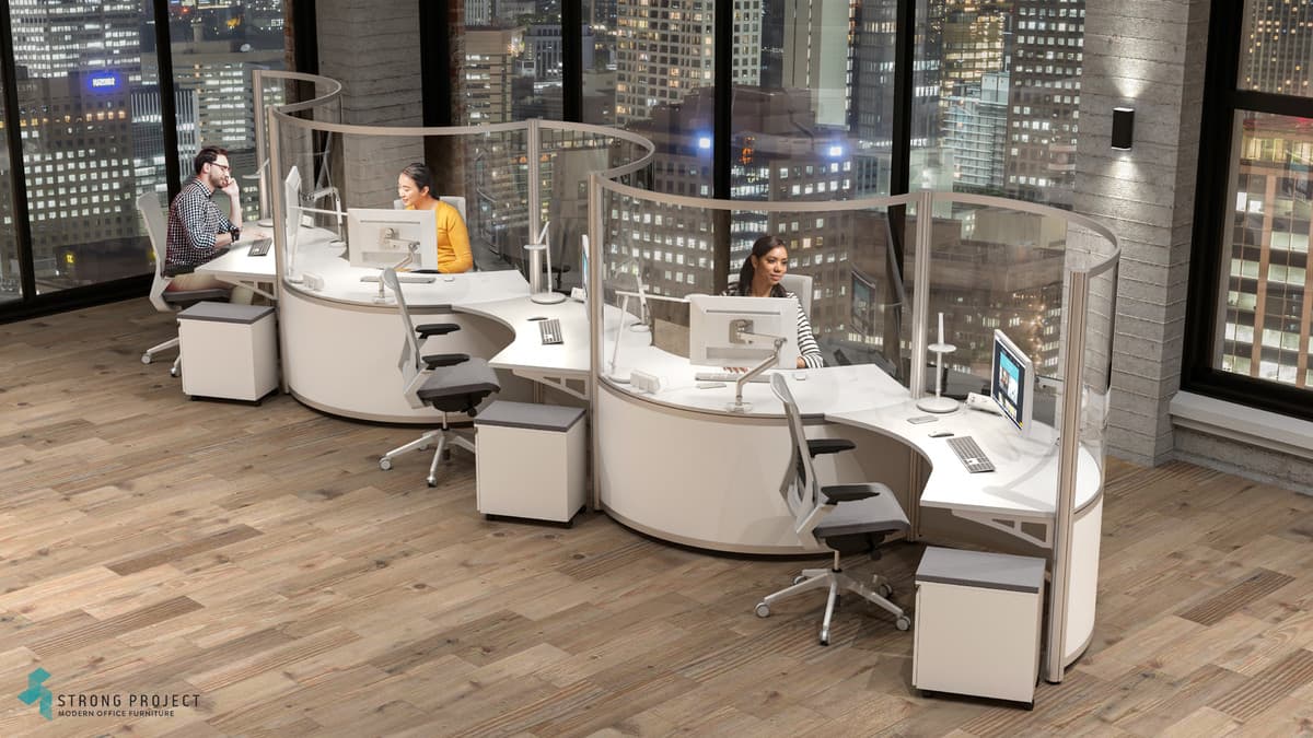 This open plan workstation design combines modern curves with space efficiency coupled with additional shielding if someone were to cough or sneeze at their desk. When placed in an open plan, the curved geometry of the pods provides a more organic flow and futuristic vibe than rows and rows of linear cubicles.