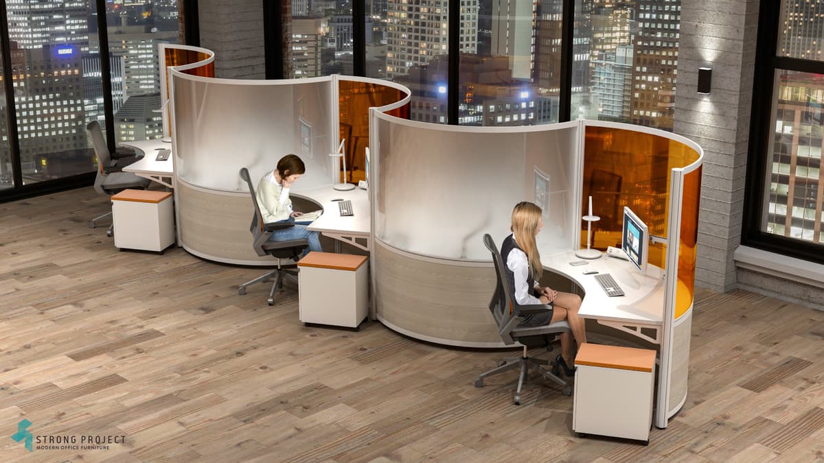 This open plan workstation design combines modern curves with space efficiency coupled with additional shielding if someone were to cough or sneeze at their desk. When placed in an open plan, the curved geometry of the pods provides a more organic flow and futuristic vibe than rows and rows of linear cubicles.