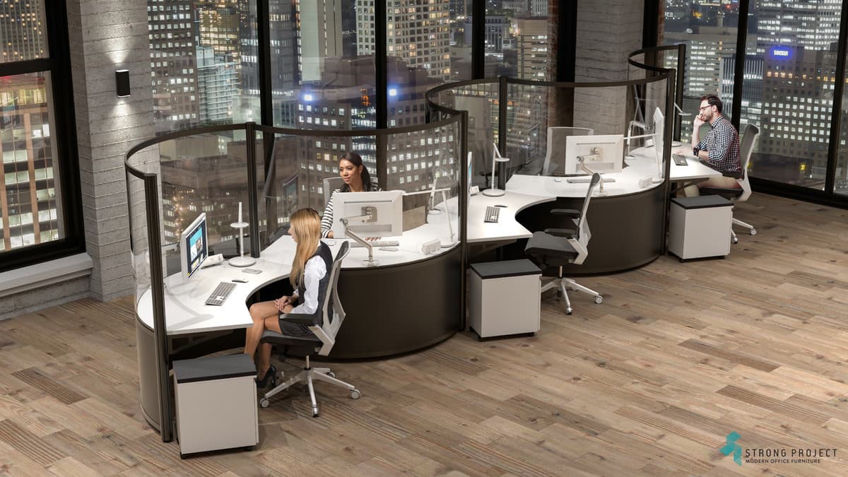 This open plan workstation design combines modern curves with space efficiency coupled with additional shielding if someone were to cough or sneeze at their desk. When placed in an open plan, the curved geometry of the pods provides a more organic flow and futuristic vibe than rows and rows of linear cubicles.