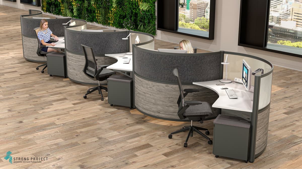 Of our many Curved Workstation designs, this particular one provides a more compact design while still delivering power and data integration. When placed in an open plan, the curved geometry of the pods provides a more organic flow than rows and rows of liner cubicles. For a truly unique, futuristic looking office space, explore our Modern Curved Workstations.