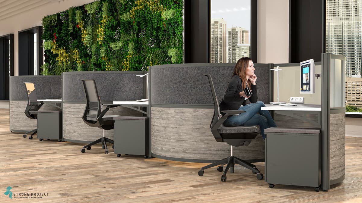 Of our many Curved Workstation designs, this particular one provides a more compact design while still delivering power and data integration. When placed in an open plan, the curved geometry of the pods provides a more organic flow than rows and rows of liner cubicles. For a truly unique, futuristic looking office space, explore our Modern Curved Workstations.