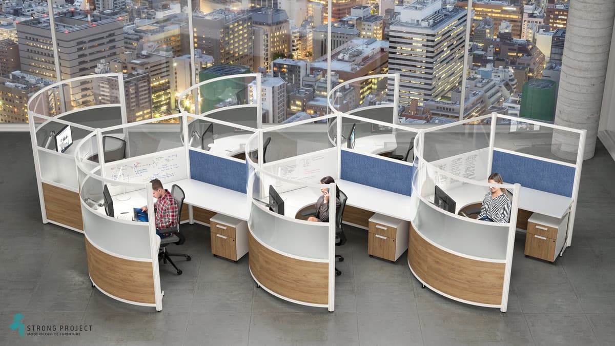 Curved Cubicles with Privacy Screens for Social Distancing with Modern Style! This curved cubicle “privacy design” is 66”H, so that there is sufficient shielding if someone were to cough or sneeze at their desk. The workstation components are made of easily cleanable materials such as laminate, acrylic and marker board. Shown in a 66”H x 96” Diameter workstation footprint. We have the ability to customize Heights for more or less privacy.