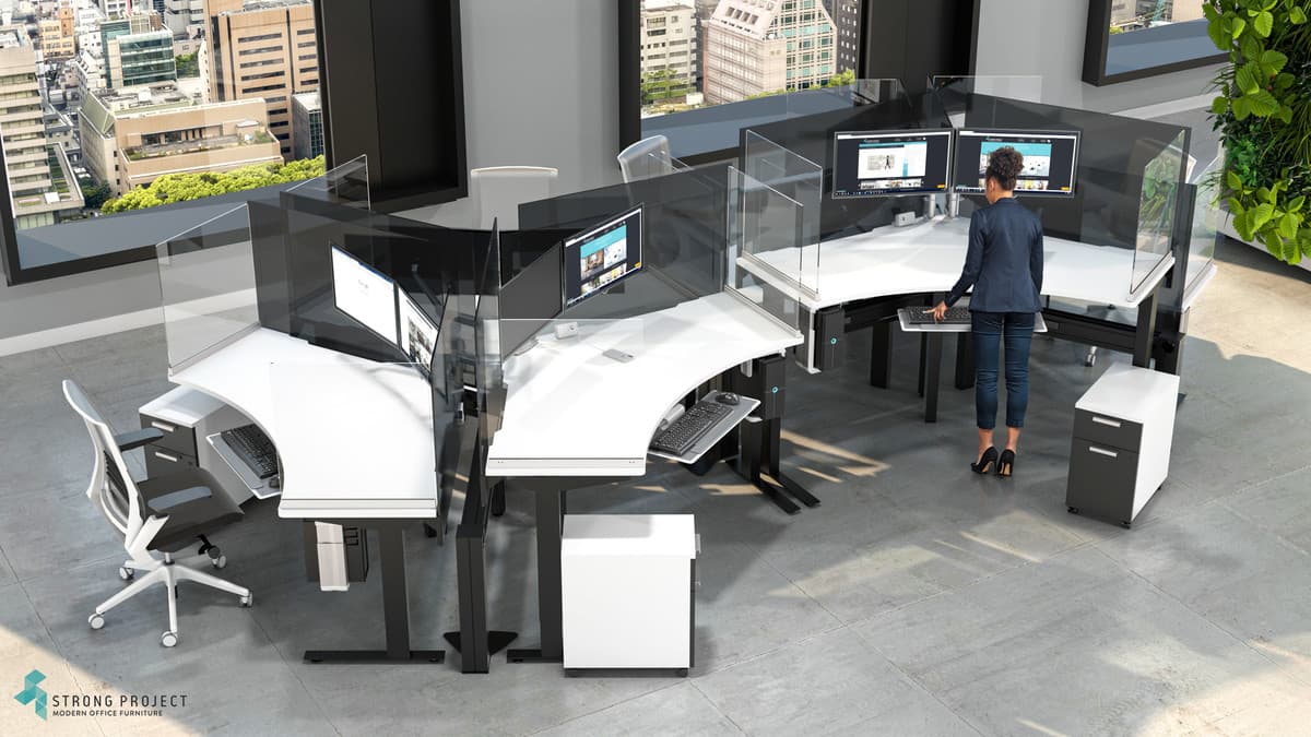 • 24”H Desktop-mounted acrylic screens travel with the height-adjustable desktop providing constant shielding if someone were to cough or sneeze at their desk.