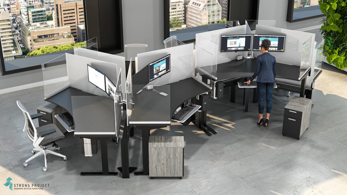 • 24”H Desktop-mounted acrylic screens travel with the height-adjustable desktop providing constant shielding if someone were to cough or sneeze at their desk.