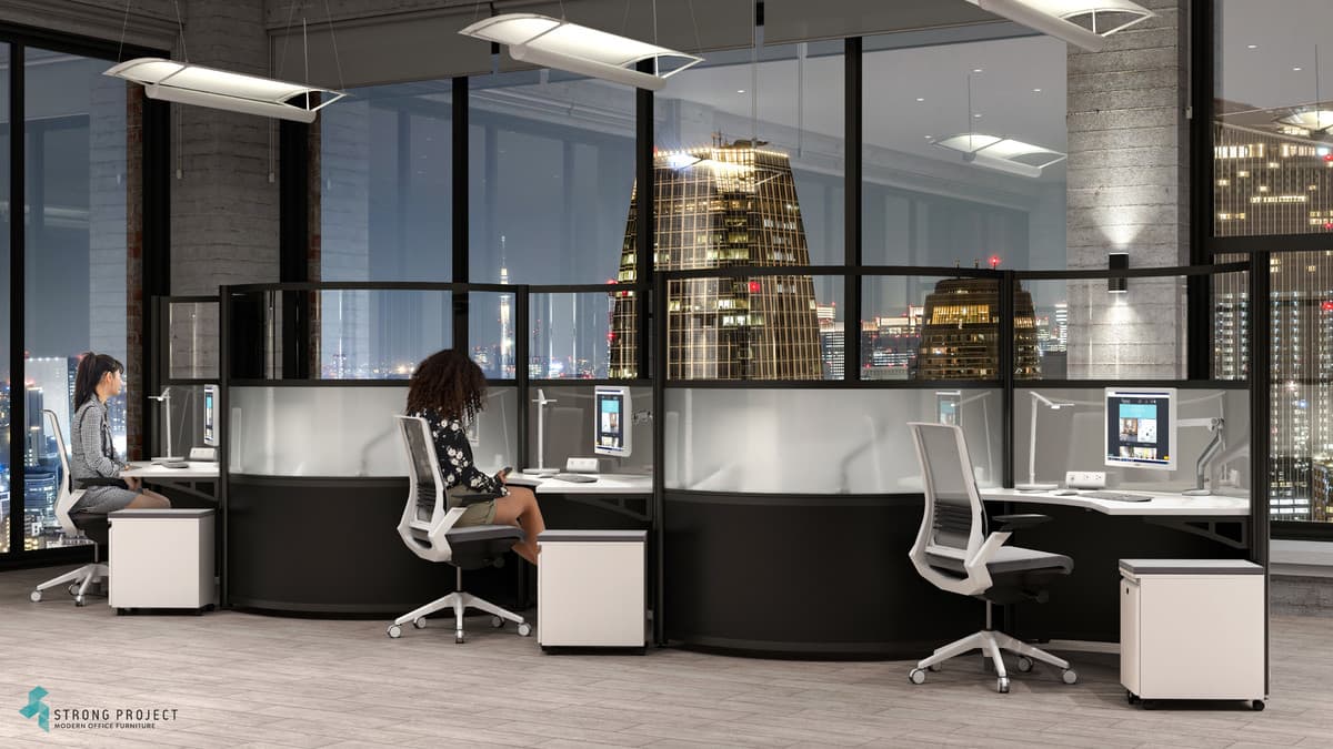 This open plan workstation design combines modern curves with space efficiency coupled with additional shielding if someone were to cough or sneeze at their desk. When placed in an open plan, the curved geometry of the pods provides a more organic flow and futuristic vibe than rows and rows of linear cubicles.