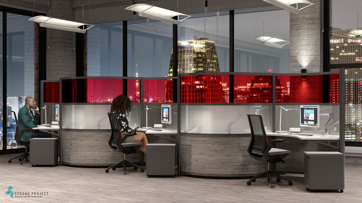 This open plan workstation design combines modern curves with space efficiency coupled with additional shielding if someone were to cough or sneeze at their desk. When placed in an open plan, the curved geometry of the pods provides a more organic flow and futuristic vibe than rows and rows of linear cubicles.