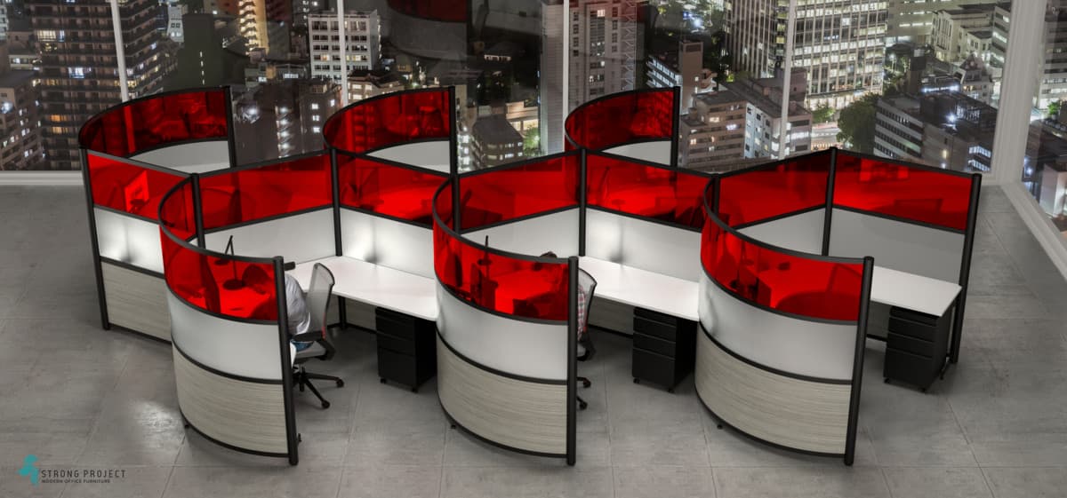 Curved Cubicles with Privacy Screens for Social Distancing with Modern Style! This curved cubicle “privacy design” is 66”H, so that there is sufficient shielding if someone were to cough or sneeze at their desk. The workstation components are made of easily cleanable materials such as laminate, acrylic and marker board. Shown in a 66”H x 96” Diameter workstation footprint. We have the ability to customize Heights for more or less privacy.