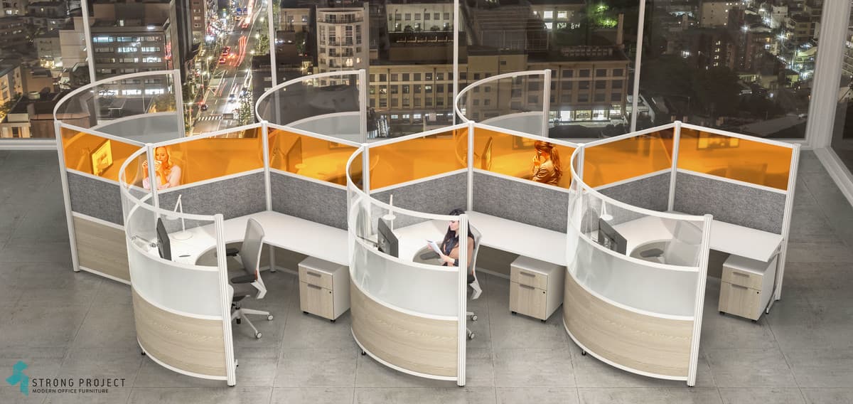 Curved Cubicles with Privacy Screens for Social Distancing with Modern Style! This curved cubicle “privacy design” is 66”H, so that there is sufficient shielding if someone were to cough or sneeze at their desk. The workstation components are made of easily cleanable materials such as laminate, acrylic and marker board. Shown in a 66”H x 96” Diameter workstation footprint. We have the ability to customize Heights for more or less privacy.