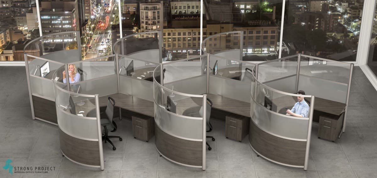 Curved Cubicles with Privacy Screens for Social Distancing with Modern Style! This curved cubicle “privacy design” is 66”H, so that there is sufficient shielding if someone were to cough or sneeze at their desk. The workstation components are made of easily cleanable materials such as laminate, acrylic and marker board. Shown in a 66”H x 96” Diameter workstation footprint. We have the ability to customize Heights for more or less privacy.