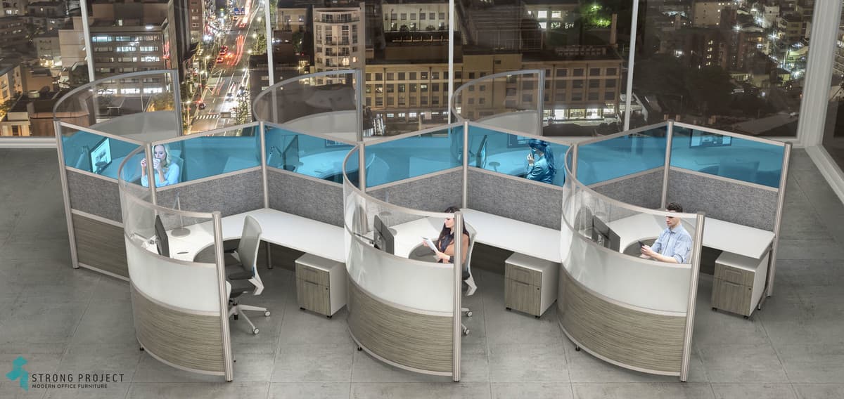 Curved Cubicles with Privacy Screens for Social Distancing with Modern Style! This curved cubicle “privacy design” is 66”H, so that there is sufficient shielding if someone were to cough or sneeze at their desk. The workstation components are made of easily cleanable materials such as laminate, acrylic and marker board. Shown in a 66”H x 96” Diameter workstation footprint. We have the ability to customize Heights for more or less privacy.