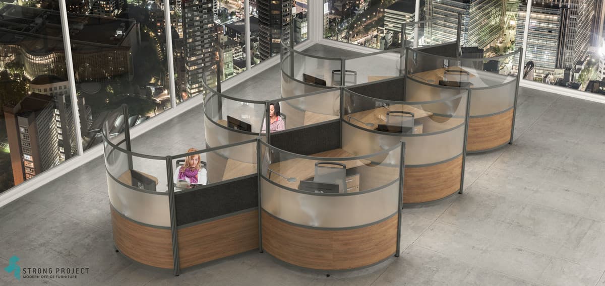 Curved Cubicles with Privacy Screens for Social Distancing with Modern Style! This curved cubicle “privacy design” is 66”H, so that there is sufficient shielding if someone were to cough or sneeze at their desk. The workstation components are made of easily cleanable materials such as laminate, acrylic and marker board. Shown in a 66”H x 96” Diameter workstation footprint. We have the ability to customize Heights for more or less privacy.