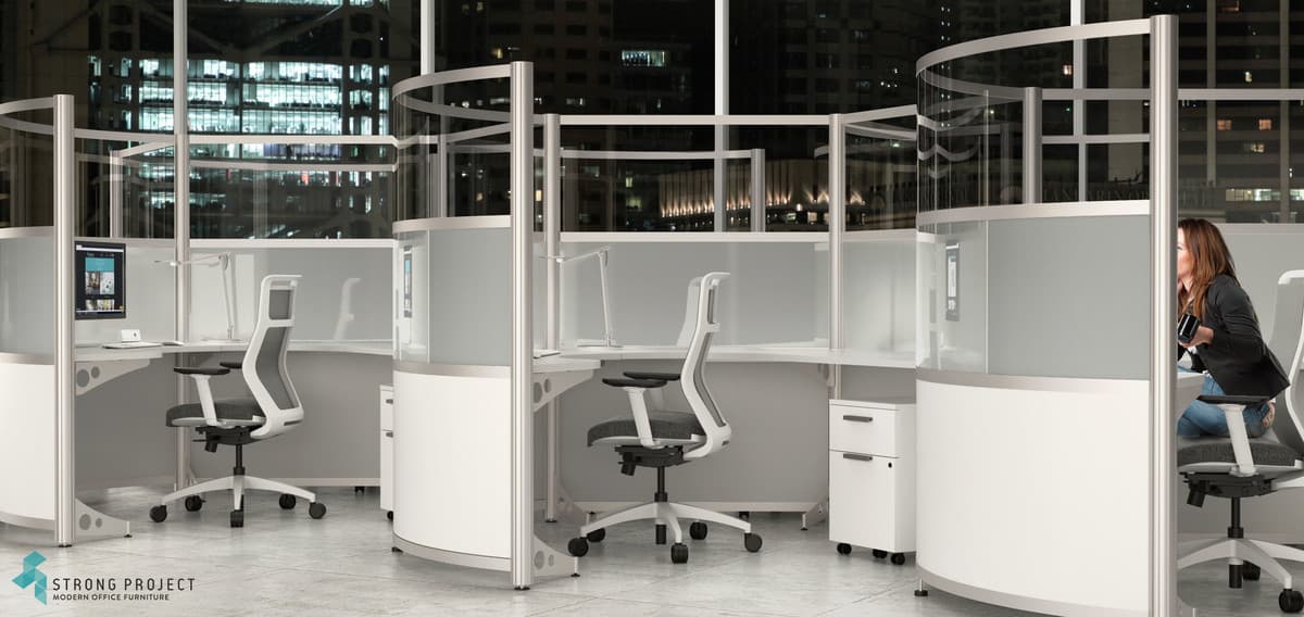 Curved Cubicles with Privacy Screens for Social Distancing with Modern Style! This curved cubicle “privacy design” is 66”H, so that there is sufficient shielding if someone were to cough or sneeze at their desk. The workstation components are made of easily cleanable materials such as laminate, acrylic and marker board. Shown in a 66”H x 96” Diameter workstation footprint. We have the ability to customize Heights for more or less privacy.