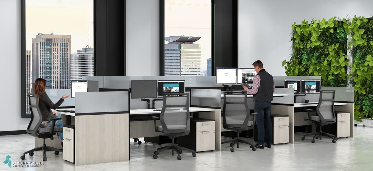 The Station size as shown is 30'D x 60'W x 54'H. Other common sizes for this design would be 30'D x 48'W (on the smaller side) and 30'D x 72'W if more desktop space is needed. Panel heights are customizable. There are numerous laminate panel applications in modern woodgrains as well as white. The interior acoustic felt comes in 15 different colors to work with your building interior and brand.