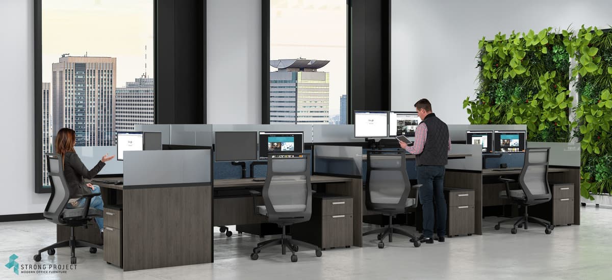 The Station size as shown is 30'D x 60'W x 54'H. Other common sizes for this design would be 30'D x 48'W (on the smaller side) and 30'D x 72'W if more desktop space is needed. Panel heights are customizable. There are numerous laminate panel applications in modern woodgrains as well as white. The interior acoustic felt comes in 15 different colors to work with your building interior and brand.